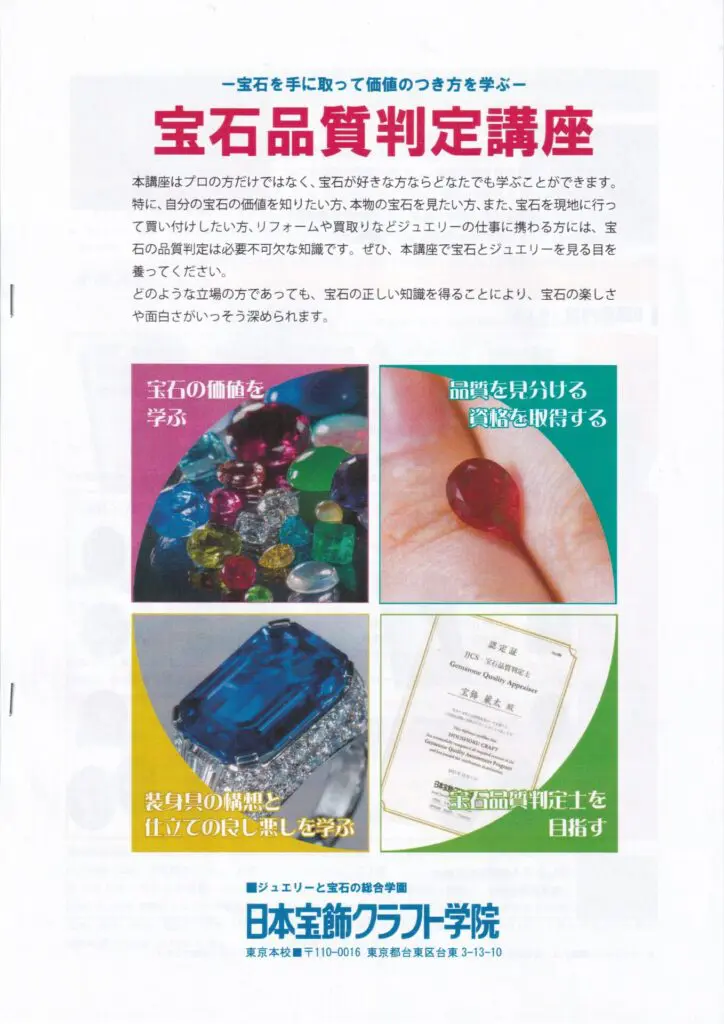 次に宝石品質判定講座です。宝石の鑑別にプラスして、宝石の価値(値段)の付き方を学ぶことができます。宝石の良し悪しがわかるようになります。