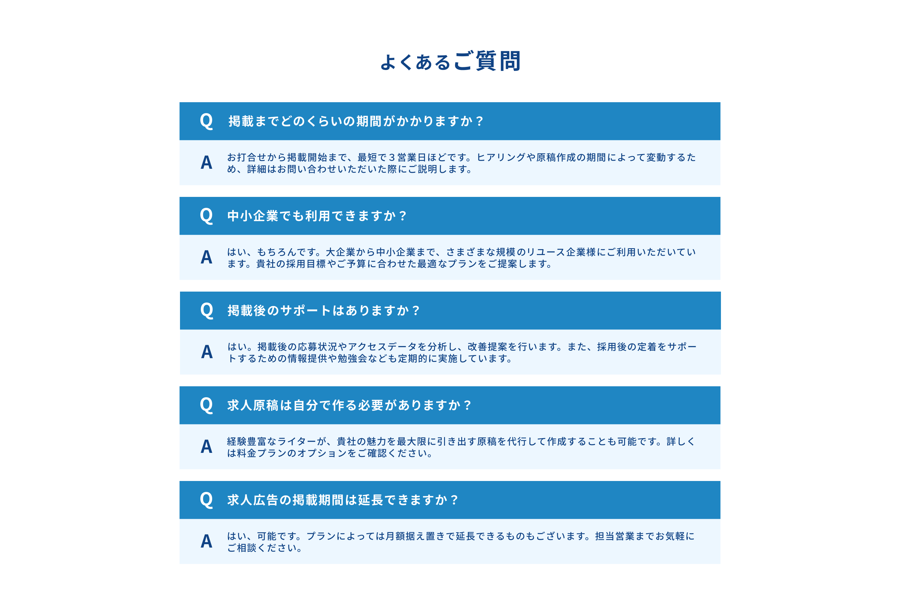 業界に特化した媒体のため、もともと関心を持つ応募者が集まりやすく、マッチ度が高い。短期間で採用が決まり、採用効率が大きく改善した。業界特化の認知度・検索性の高さがあり、「リユース転職」という媒体名自体が求職者の信頼感につながっている。今後も営業職・管理職候補・倉庫系人材など幅広い職種で活用していきたい。