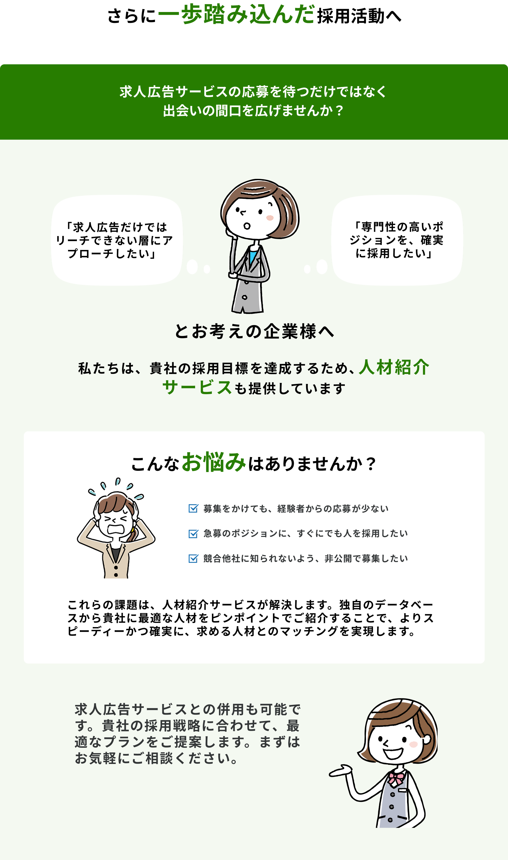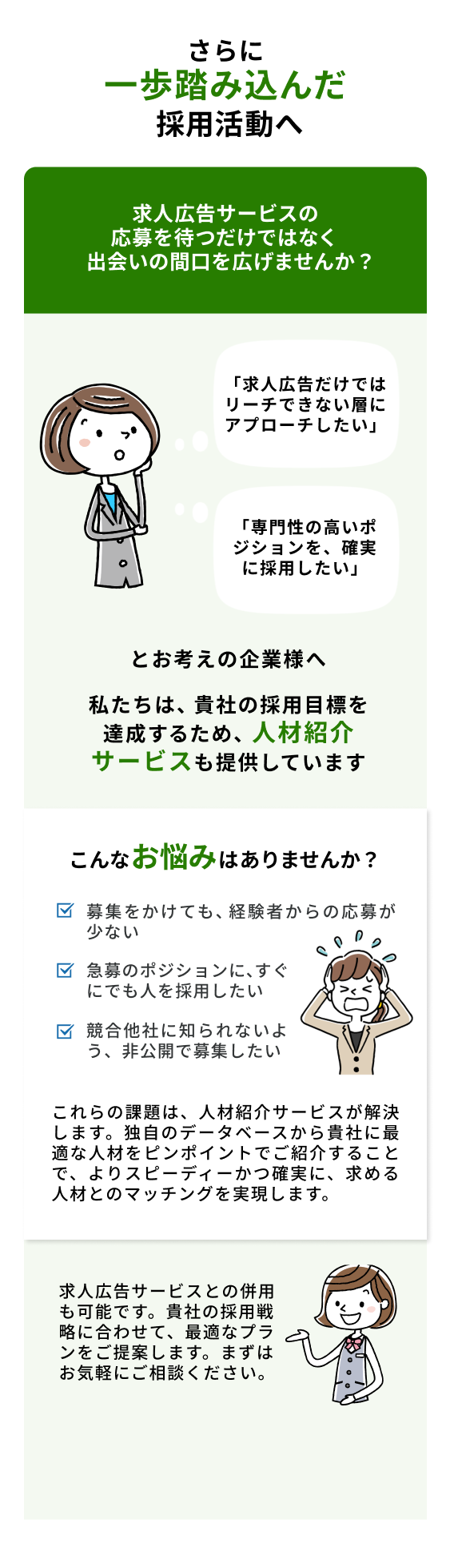 事業拡大を進める中、幅広い職種で人材不足が発生。新卒採用を中心に行ってきたが、拡大スピードに対して人員確保が追いつかず、中途採用の必要性が高まっていた。他求人媒体や紹介会社も利用していたが、応募をかけても業界への興味関心が低い方が多く、紹介数そのものも採用数や充足期限に対して少ないという課題があった。